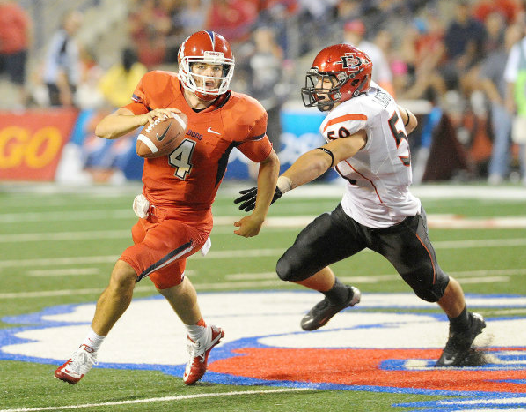 Derek Largent chases Fresno State quarterback Derek Carr. He played a different role vs. Colorado State, grabbing two interceptions in the game (Ernie Anderson/SDSU Media Relations)