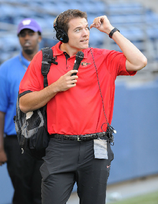 Kevin O’Connell working as a sideline reporter in the 2012 season opener vs. Washington (Ernie Anderson/SDSU Media Relations)