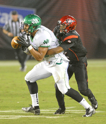 McFadden breaks up a pass in the 2012 season. His combine performance will likely weigh heavy on his draft stock. (Ernie Anderson/SDSU Media Relations)
