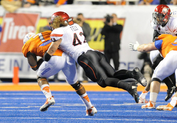 Aztec linebacker Jake Fely makes a big tackle in the win over Boise State (Ernie Anderson/SDSU Media Relations)