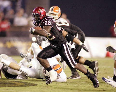 Lynell Hamilton carries the ball against UTEP in the 2003 season. Photo Credit: Ernie Anderon/SDSU Media Relations